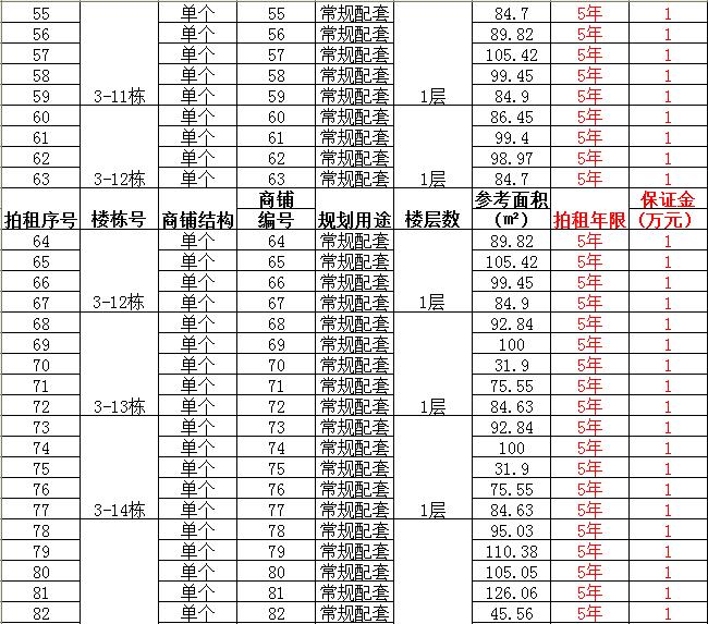 (一)拍租單個(gè)商鋪129間,使用期5年,每間商鋪預(yù)交競(jìng)租保證金1萬元, 詳見商鋪簡(jiǎn)介(欲競(jìng)租多間商鋪,保證金類推);