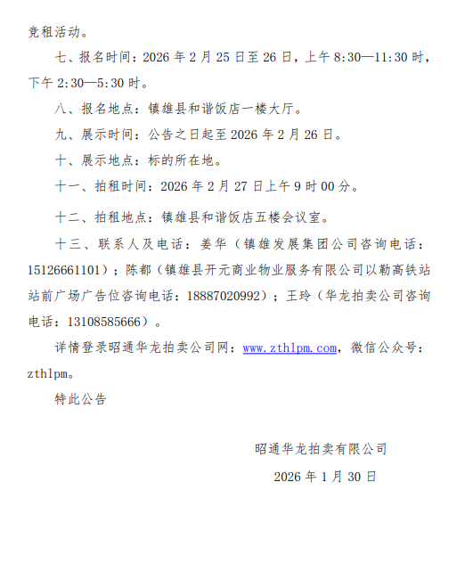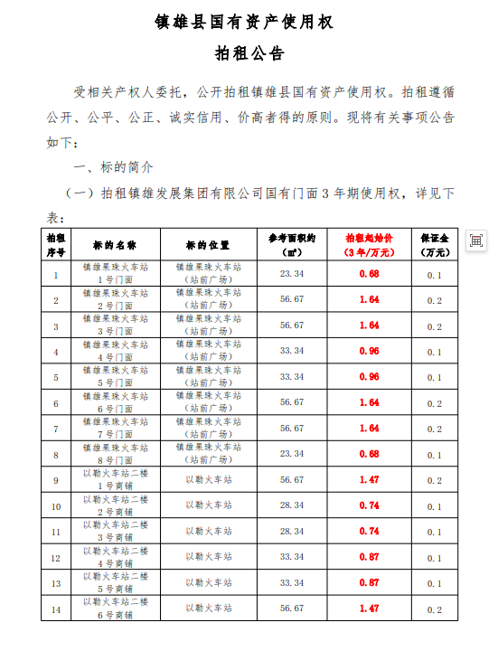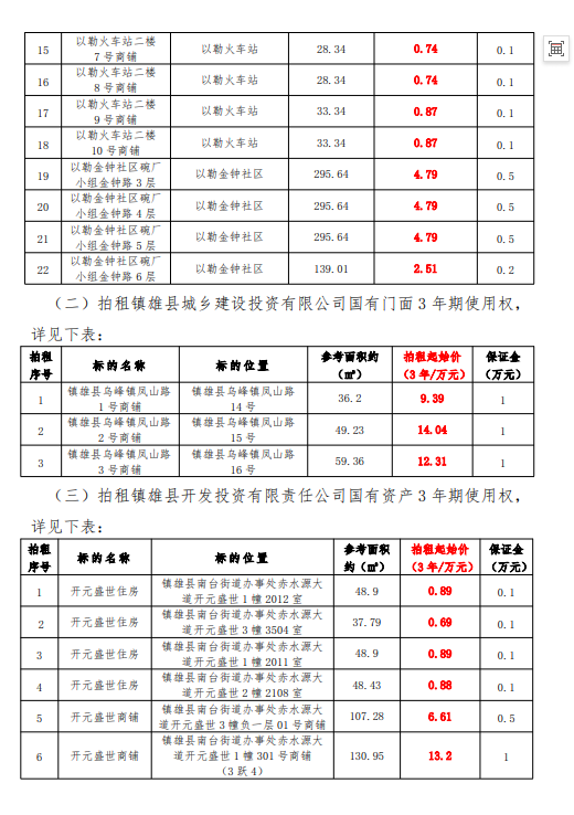 鎮(zhèn)雄縣國有資產(chǎn)使用權拍租公告